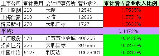 0.4473%,这是审计费用占营业收入的平均比重。下表是比例最高和最低的三家上市公司。