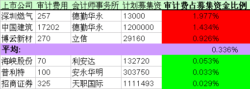 0.336%,这是审计费占募集资金的平均比重。下表列出了比重最高和最低的三家上市公司: