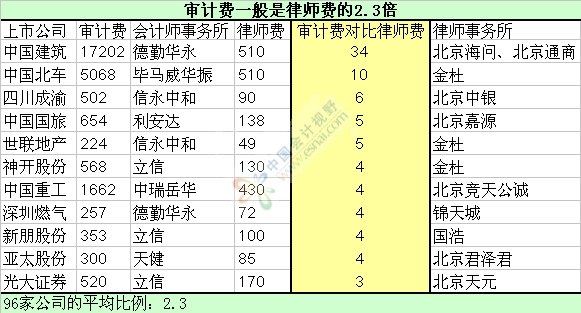 在只有6家上市公司的审计费低于律师费。最大的悬殊出现在中国建筑,它支付了17202万的审计费和510万的律师费,相差近34倍: