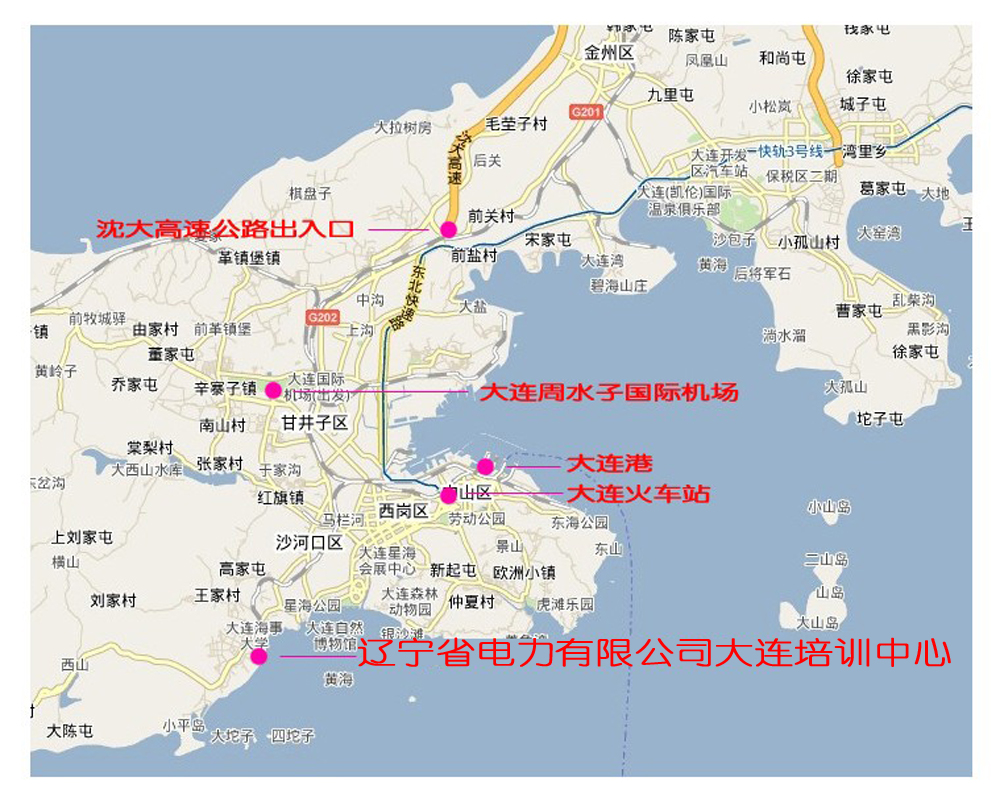 2.火车站:火车站——中山路——星海广场——黑石礁——海事大学——辽宁电力大连培训中心(计程车约30元,耗时约30分钟)。