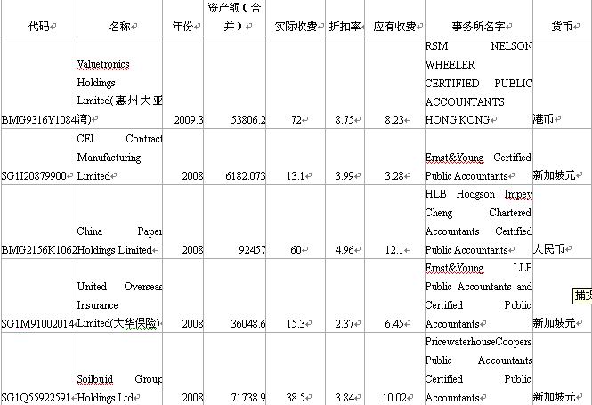 折扣率比新加坡高些,但还是比不上台北,而审计师呢,一水的四大,不约而同,异口同声,英雄所见略同--怎么形容呢,这样本可真是随机选的啊。